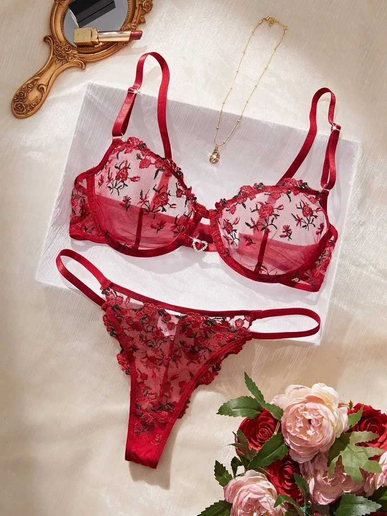 Women's Heart Stone Embroidered Lingerie Set